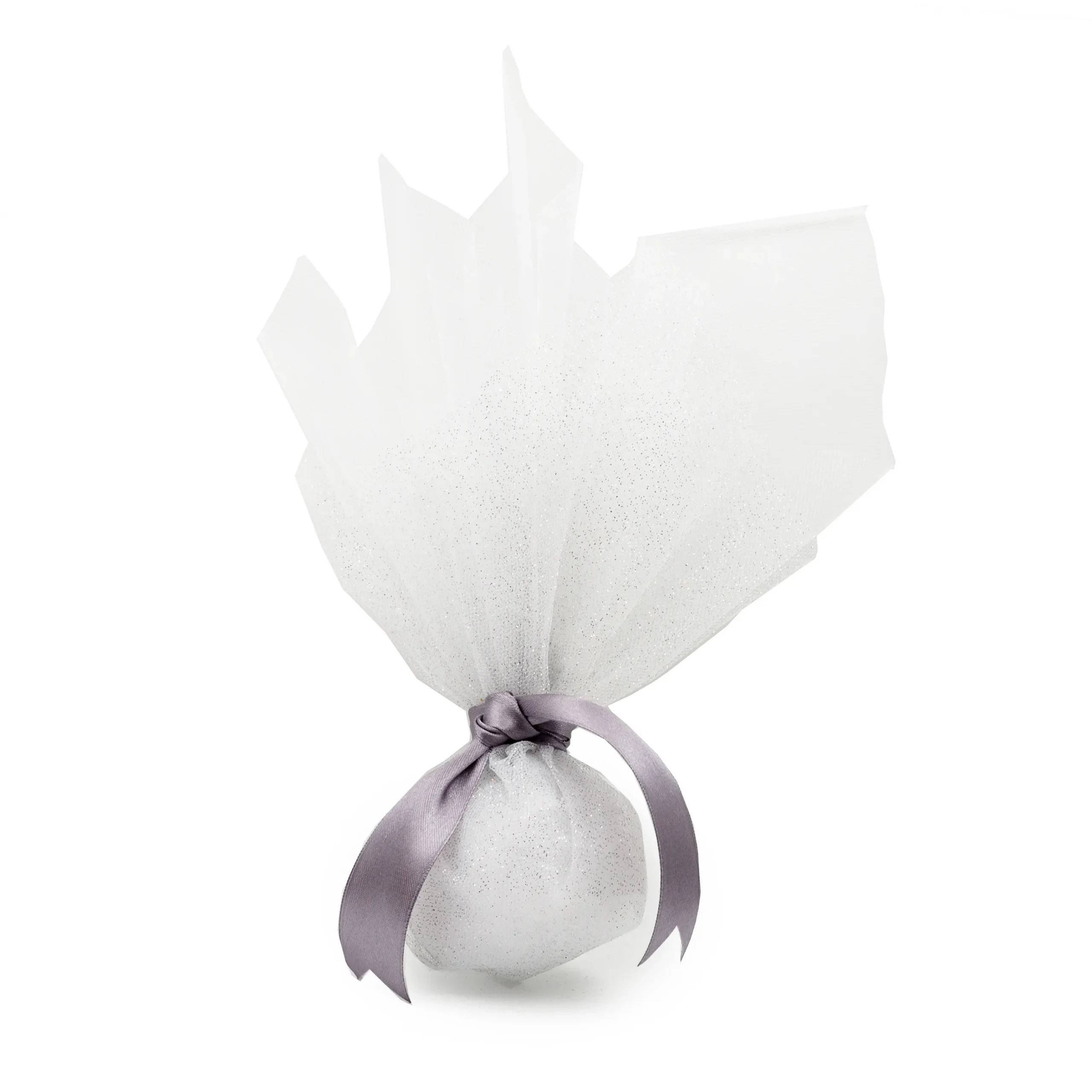 Tulle bonbonniere (40 cm) with silver glitter tulle (37 cm) & knot of satin silver ribbon