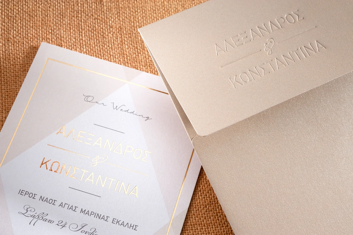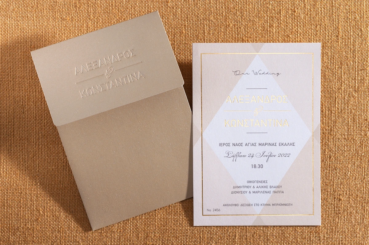 Προσκλητήριο γάμου με γεωμετρικά σχήματα ρόμβο και χρυσά ονόματα. Τα σχέδια και τα ονόματα είναι εκτυπωμένα με θερμοτυπία χρυσό foil χρυσοτυπία. Το προσκλητήριο μπορεί να γίνει όλο και με απλή εκτύπωση. Ο φάκελος είναι σε ανοικτό χρώμα πούρου με βαθυτυπία τα μονογράμματα.