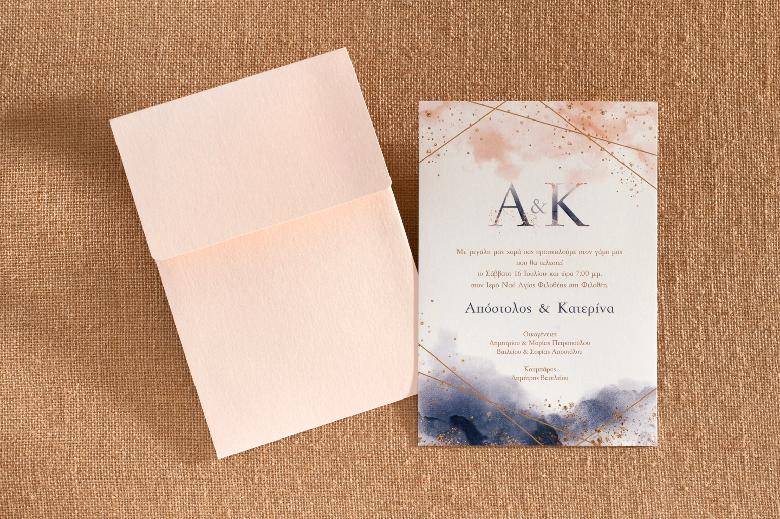 Προσκλητήριο γάμου τυπωμένο σε κάρτα watercolor σε nude και μπλε αποχρώσεις και φάκελος σε nude χρώμα.