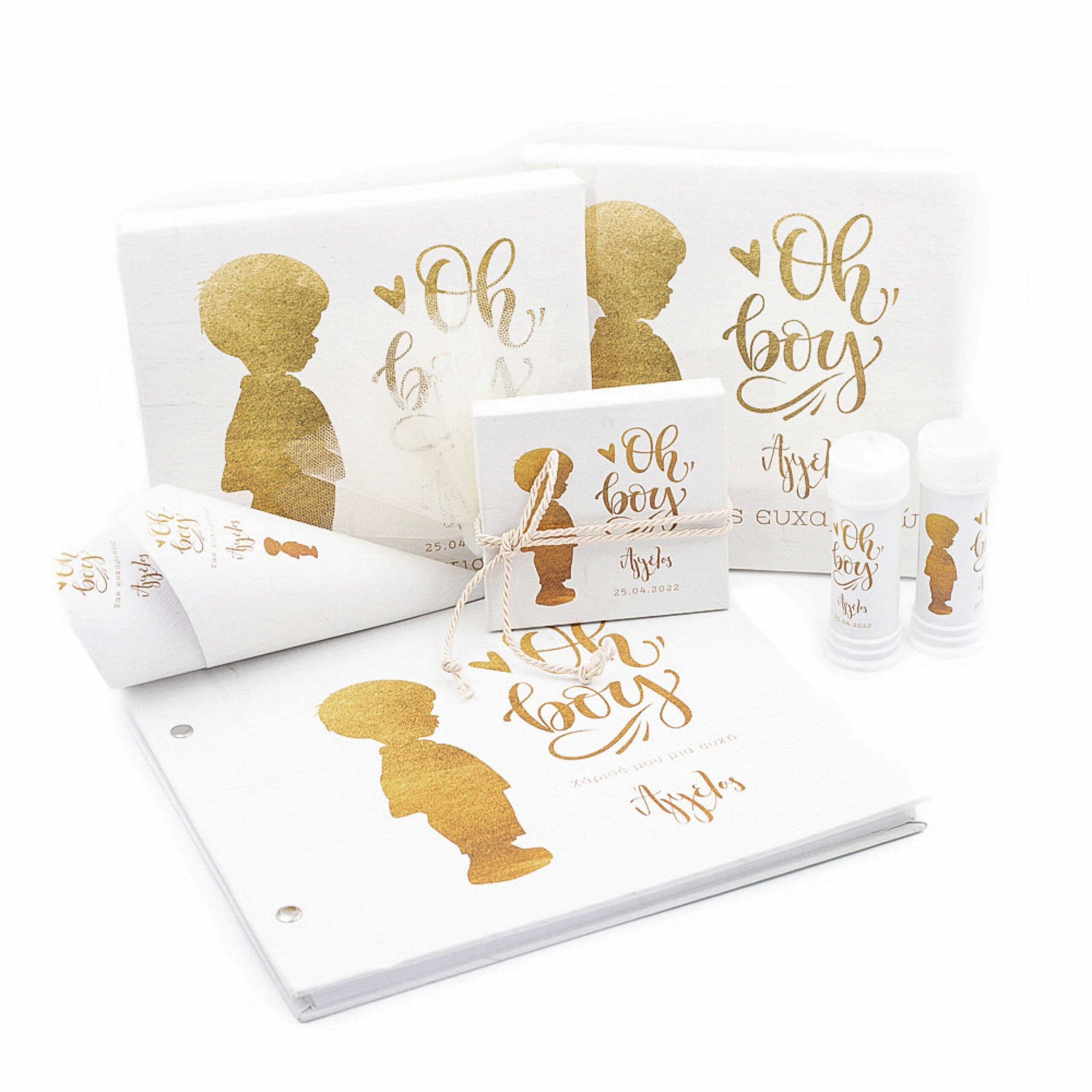 The photo shows the following with thematic printing: two 20*20 cm canvases, a wish book, paper cones & soap bubbles, a tin can.