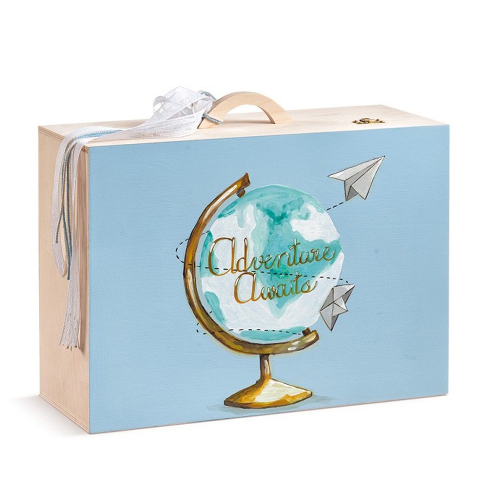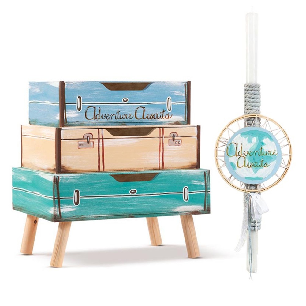 Μοντέρνο κουτί βαπτιστικών σε στυλ συρταριέρας. Το θέμα είναι το ταξίδι στον κόσμο. Το έπιπλο αποτελείται από 3 συρτάρια και οι αποχρώσεις είναι σε βεραμάν,εκρού-μπεζ και σιέλ. Το τέλειο διακοσμητικό για να καλωσορίσετε στον κόσμο τον μικρό θησαυρό σας.