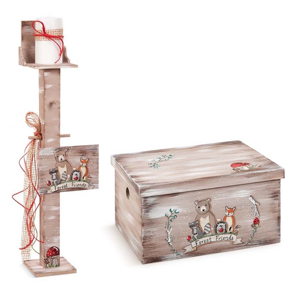 Ξύλινος κηροστάτης-κρεμάστρα σε καφέ brush απόχρωση. Μπροστά είναι διακοσμημένος με ξύλινο καδράκι με τα ζωάκια του δάσους. Στην τιμή περιλαμβάνεται και το κερί για την εκκλησία.