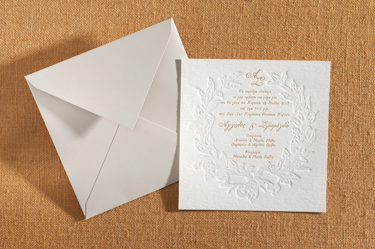 Προσκλητήριο γάμου σε off white χρώμα με βαθυτυπία το σχέδιο με το στεφάνι και χρυσοτυπία το κείμενο. Ο φάκελος σε απόχρωση μπεζ.