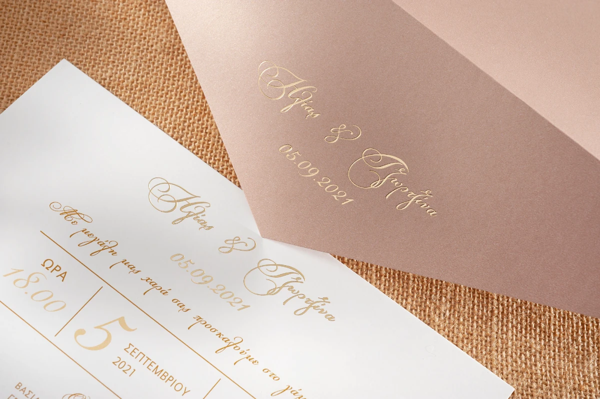 Προσκλητήριο γάμου σε λευκό χρώμα με τα μονογράμματα να έχουν γίνει με εκτύπωση χρυσοτυπίας. Ο φάκελος είναι σε dusty pink χρώμα και έχει τυπωμένα τα μονογράμματα & ημερομηνία με εκτύπωση χρυσοτυπίας.