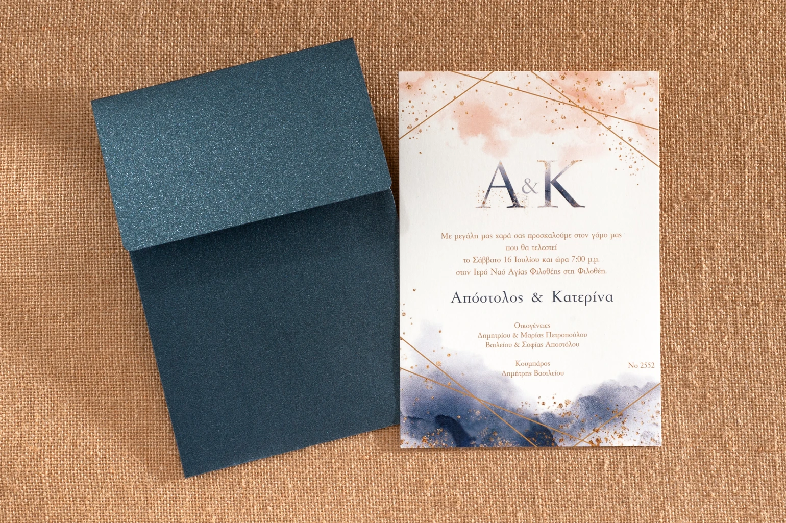 Προσκλητήριο γάμου τυπωμένο σε κάρτα με χρωματισκούς κυματισμούς και φάκελος σε μπλε σκούρο χρώμα.