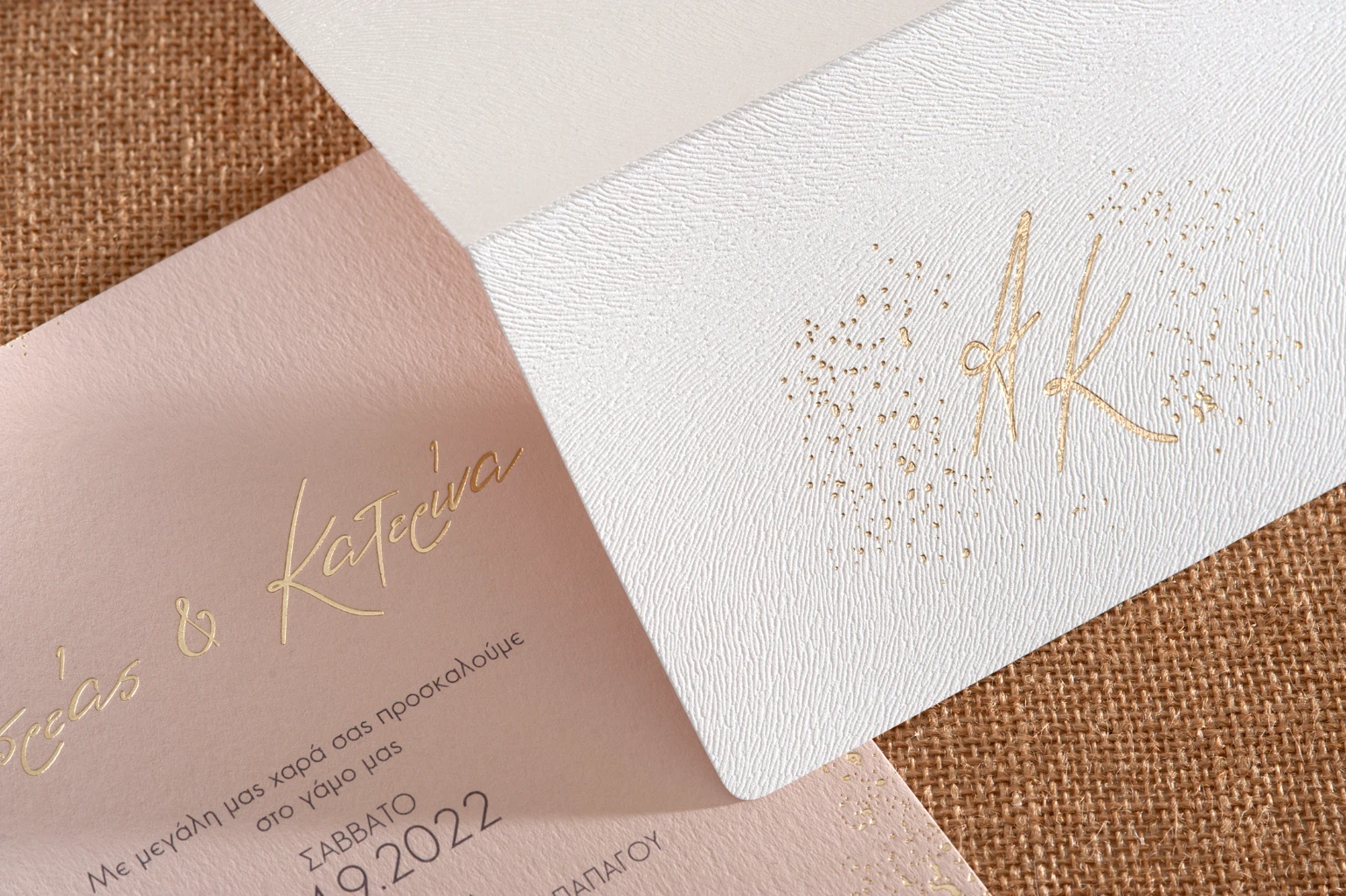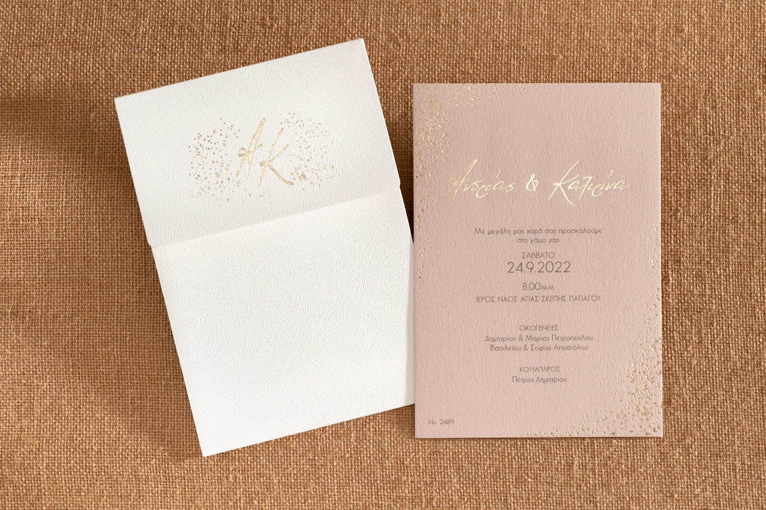 Προσκλητήριο γάμου με ροζ-nude κάρτα,  εκτύπωση μελάνης στο κείμενο και χρυσοτυπία στα ονόματα του ζευγαριού. Ο φάκελος είναι ιβουάρ  με ιδιαίτερη υφή και χρυσοτυπία τα μονογράμματα του ζευγαριού.