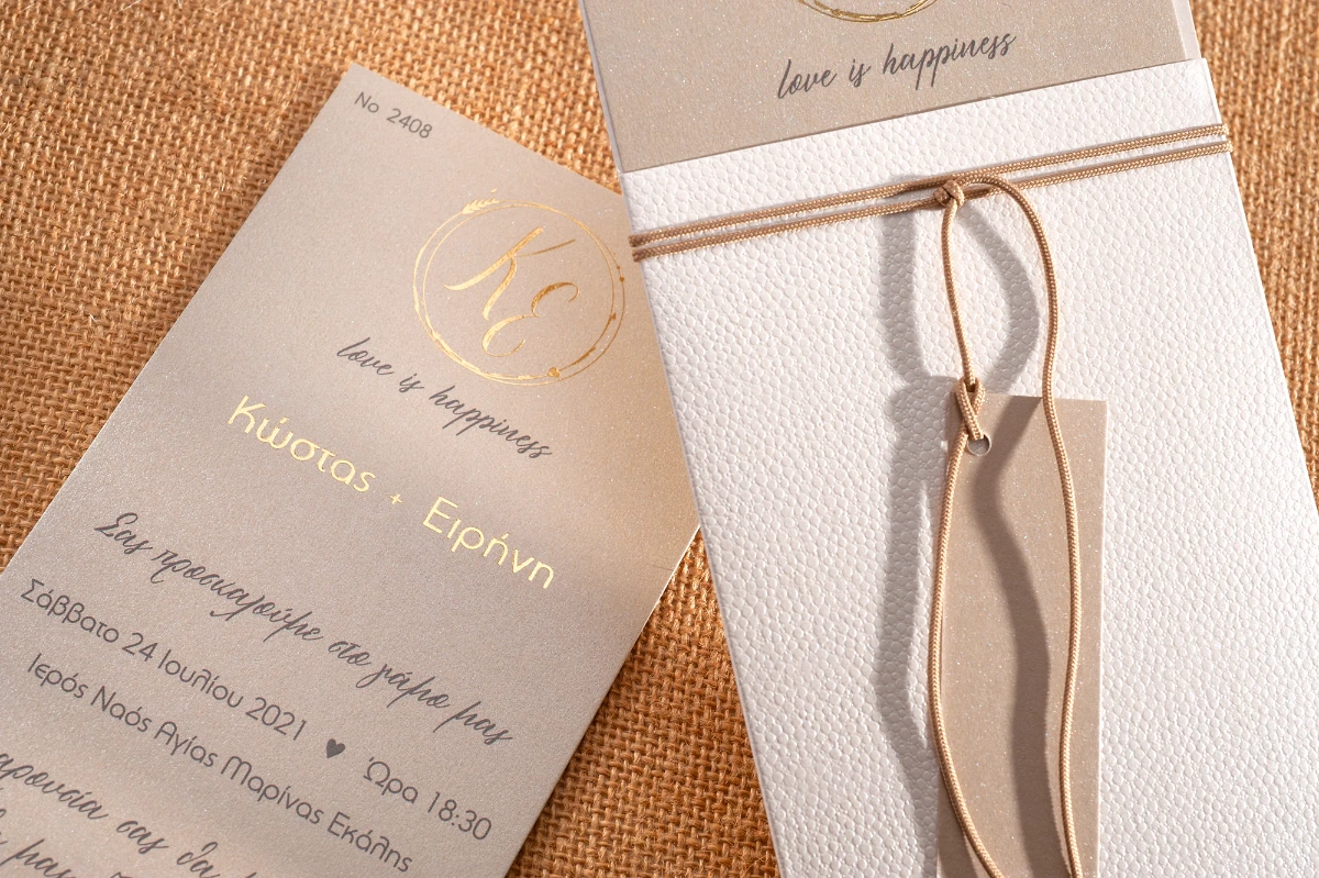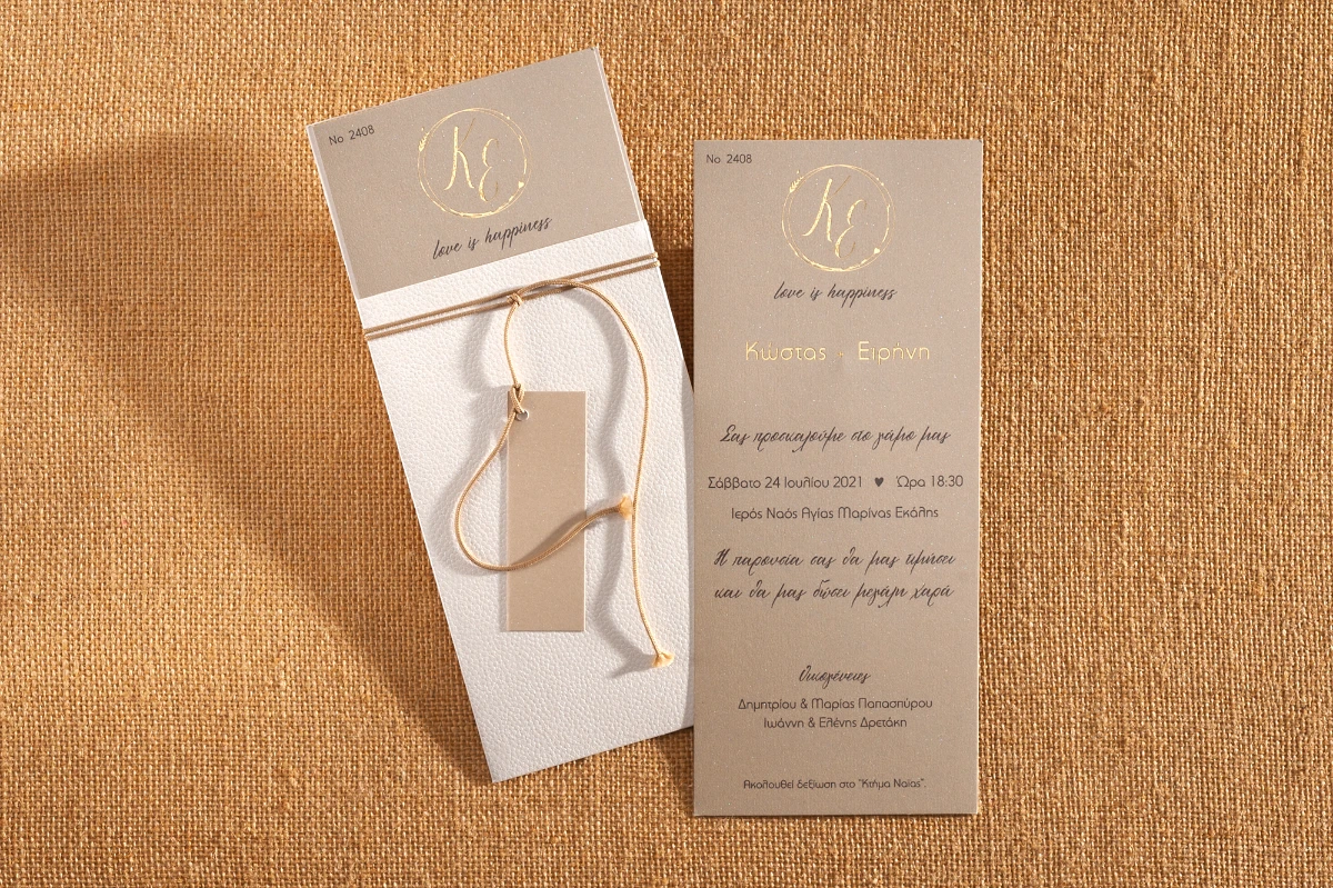 Προσκλητήριο γάμου ορθογώνιο σε καφέ κάρτα με θερμοτυπία χρυσό foil, χρυσοτυπία, και συρταρωτός φάκελος εκρού σε ιδιαίτερο χαρτί με εγκοπή για να φαίνονται τα αρχικά του ζευγαριού και καρτελάκι δεμένο με κορδονάκι.