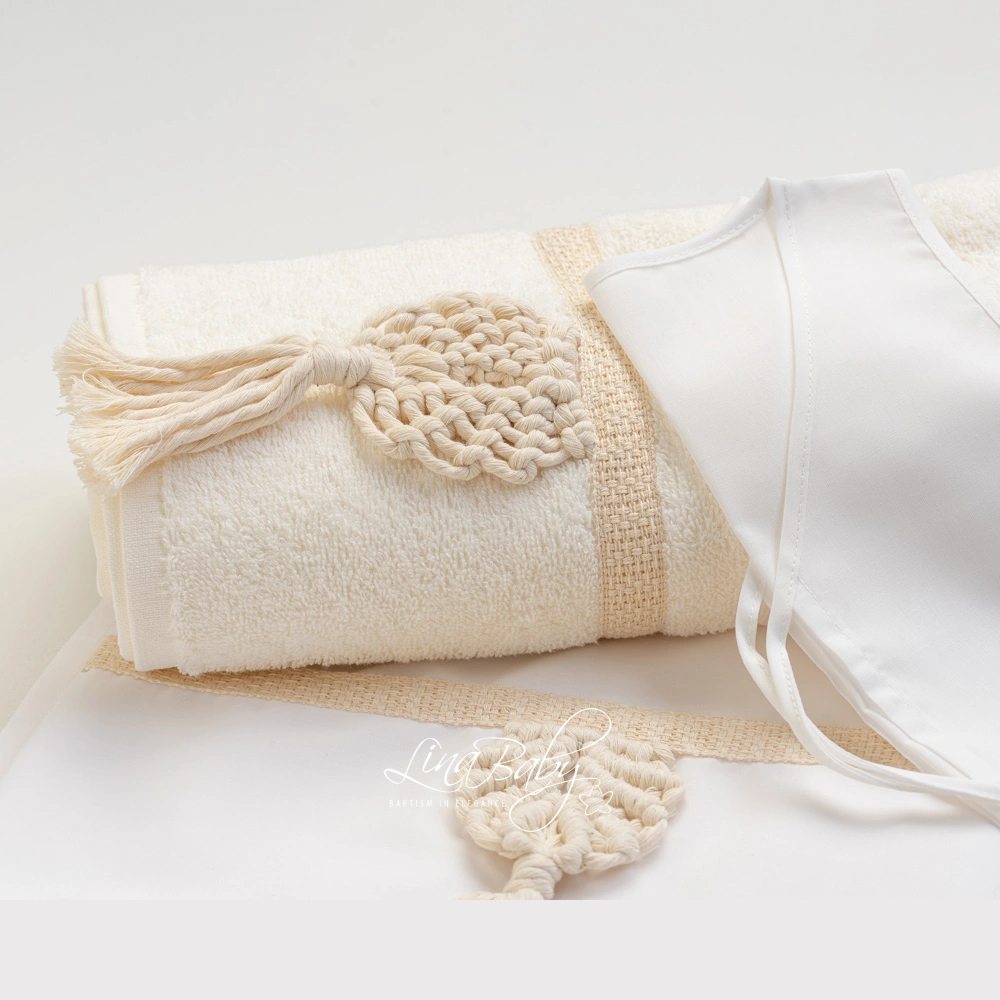 Βαμβακερό σετ λαδόπανου σε εκρού χρώμα με ιβουάρ τρέσα και μακραμέ χειροποίητο διακοσμητικό σχέδιο. Πετσέτα 70*140*360g. OEKO-TEX STANDARD 100